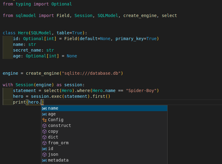 SQLModel was designed to be easy and intuitive to use to ensure the best development experience, with autocompletion everywhere.